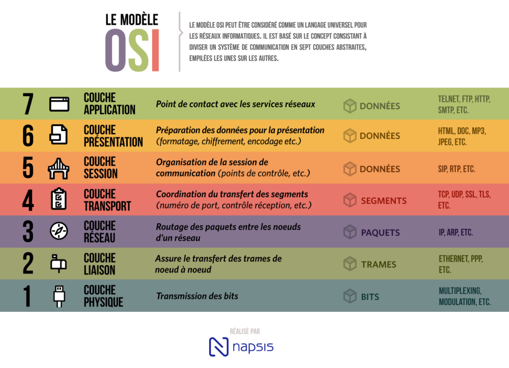 Le modèle OSI (Open Systems Interconnection) est un cadre de référence qui définit les standards pour la conception et l’implémentation des protocoles de communication réseau. Il divise la communication réseau en sept couches distinctes, chacune avec ses propres fonctions et responsabilités. Chaque couche communique avec les couches adjacentes pour assurer un transfert de données efficace et fiable à travers le réseau. Les sept couches du modèle OSI sont :