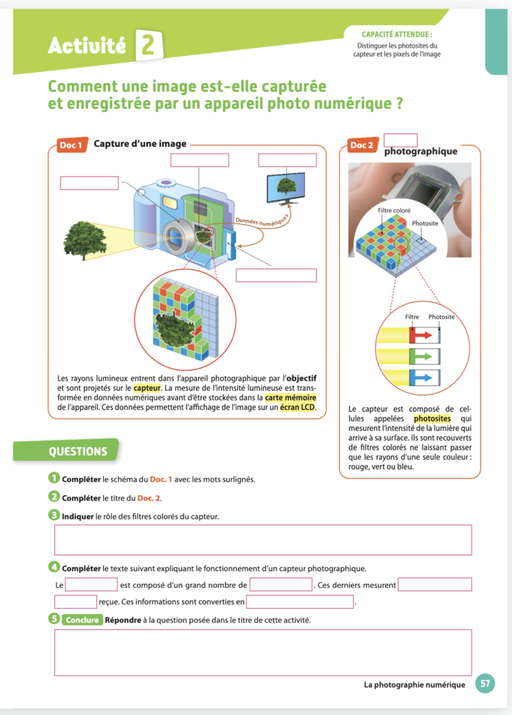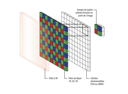 - Un filtre de Bayer est placé sur le capteur pour diviser la lumière en trois couleurs primaires : Rouge, Vert, et Bleu (RVB).